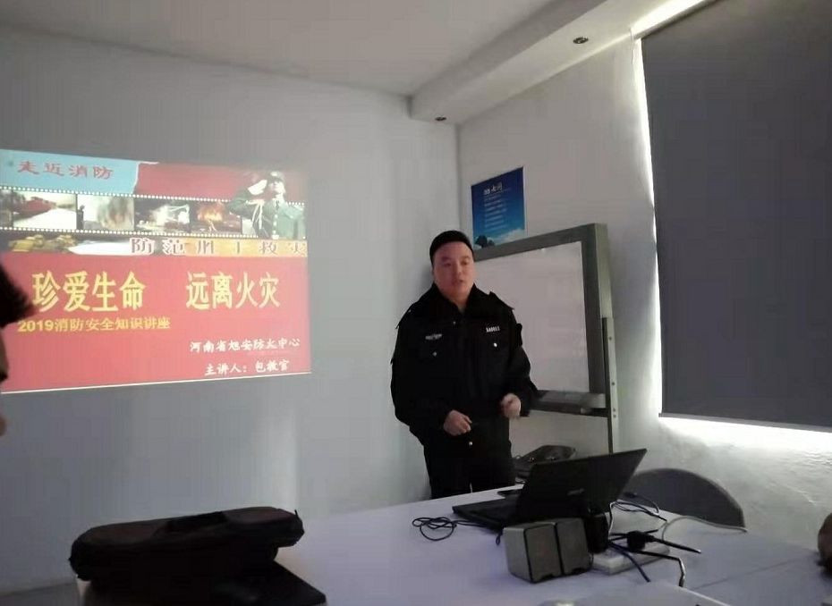 在一个小时的讲座中,河南旭安消防队的包教官利用幻灯片详细讲述了消防安全“四个能力”建设,并从防火、逃生、报警自救、灭火等几个方面对大家进行介绍。包教官以火灾事故案例、消防知识、家庭防火及疏散逃生等案例为主要内容,培训了各种灭火器材的灭火原理和使用方法,指导大家如何正确使用灭火器进行灭火,并通过生动详实的讲解、幽默互动的方式与大家进行交流。包教官建议大家要爱护消防公共设施,切实提高防火安全意识,增强火灾的防控和自救能力。