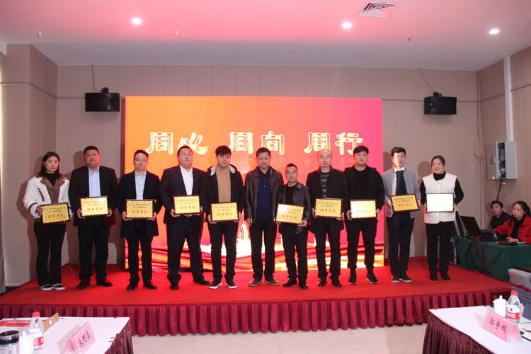 (图十一 市工商联调研员赵建民为新当选的青创会常务理事颁牌并合影)