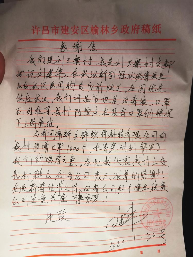 刘王寨村支部书记非常感激地说“武汉新型冠状病毒发生以后,现在医用物资空前缺乏,全国医用物资优先供应武汉,我们村也是物资穷尽时刻,非常感谢河南新兵锋软件科技有限公司为我村解决‘冠状病毒防疫工作’做出贡献。”