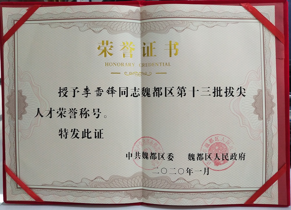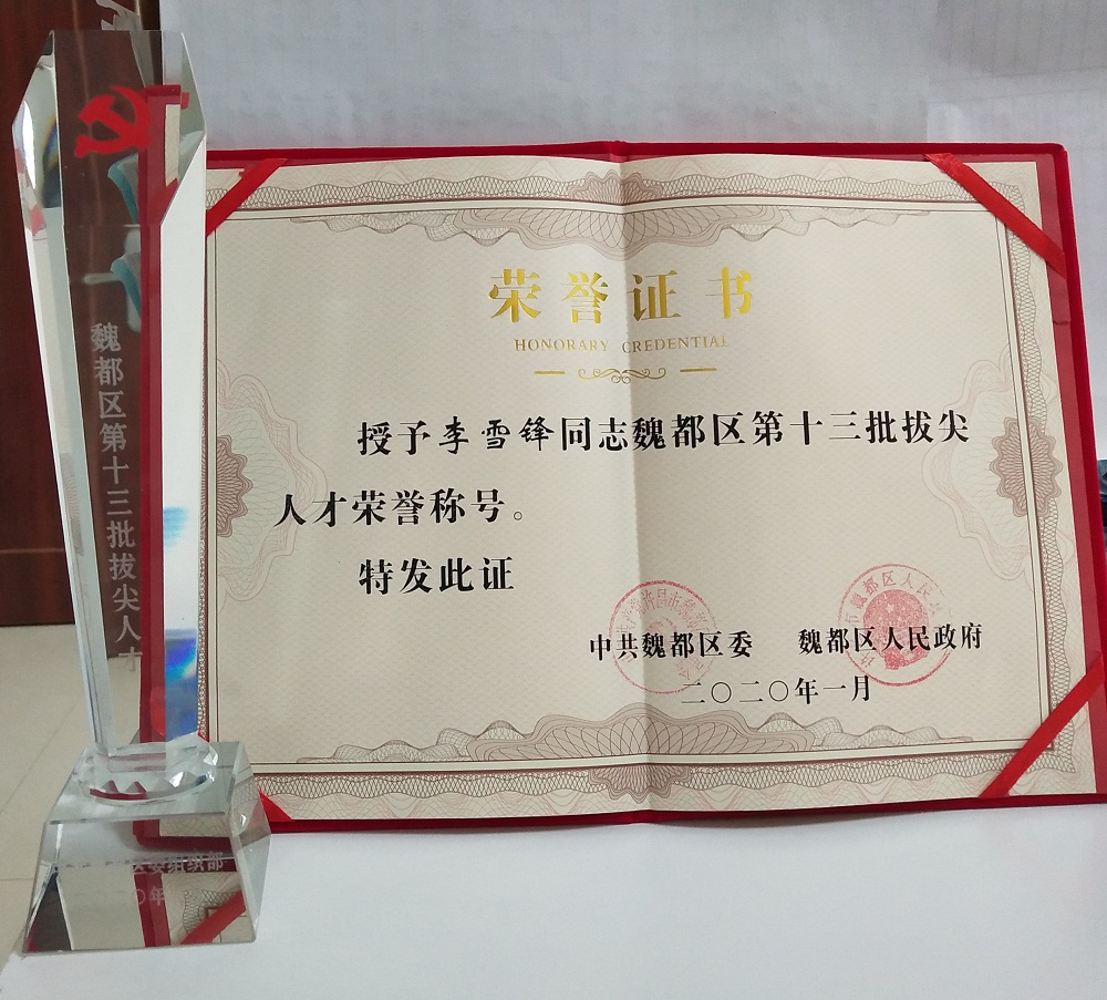 恭贺李雪锋同志荣获魏都区第十三批拔尖人才荣誉称号