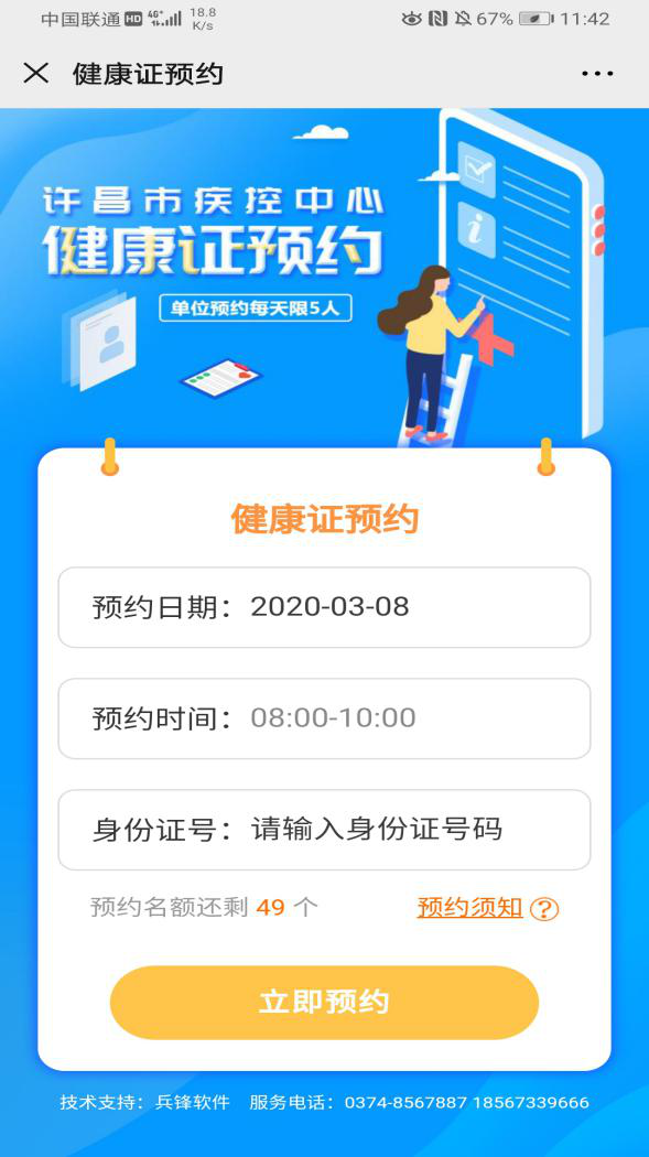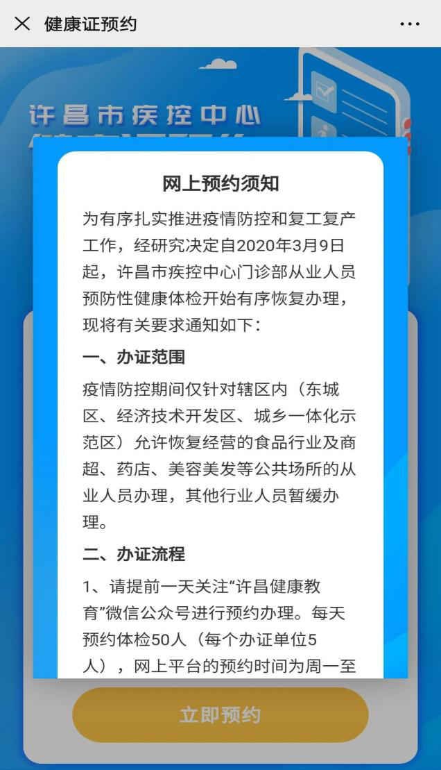 为方便许昌市从业人员办理健康证,市疾控中心与河南新兵锋软件科技有限公司联合开发的“健康证预约平台”于2020年3月9日正式上线。
