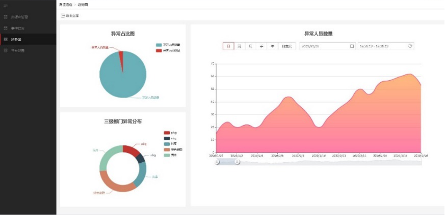 2、趋势分析,形成体温数据趋势图,展示异常体温部门分布。