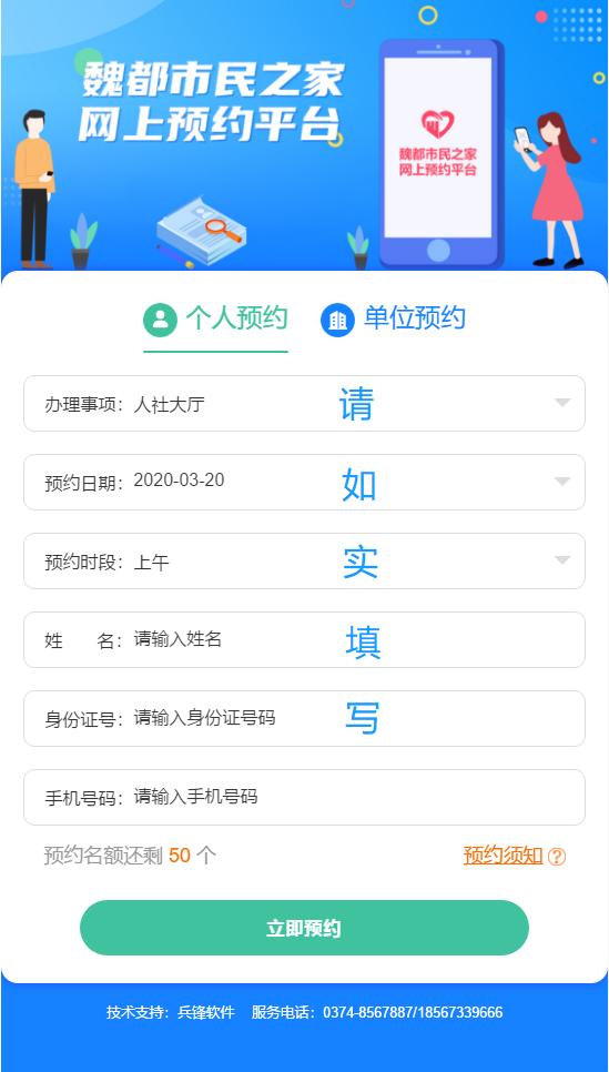 目前支持当天预约第二天的事项办理名额,预约成功后,请您戴好口罩,按照约定有效时间到达魏都市民之家,从一楼正门“2号网上预约快速通道”经过体温检测(正常方可进入)、出示“健康码”后(绿色方可进入),进入大厅办理业务。