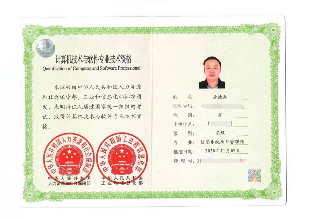 【兵锋喜讯】贺我公司唐德兵同志荣获信息系统项目管理师高级职称证书