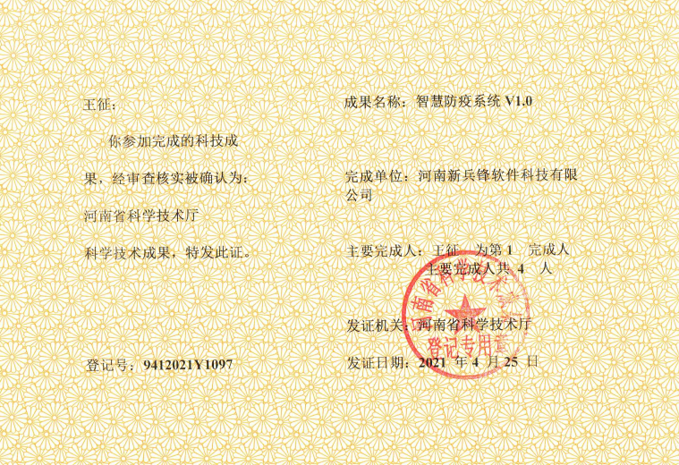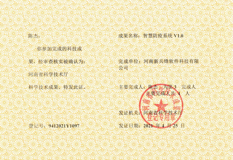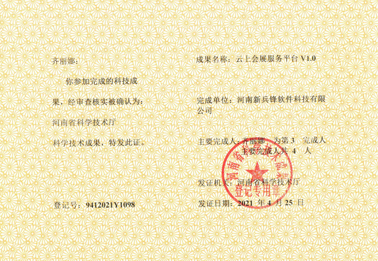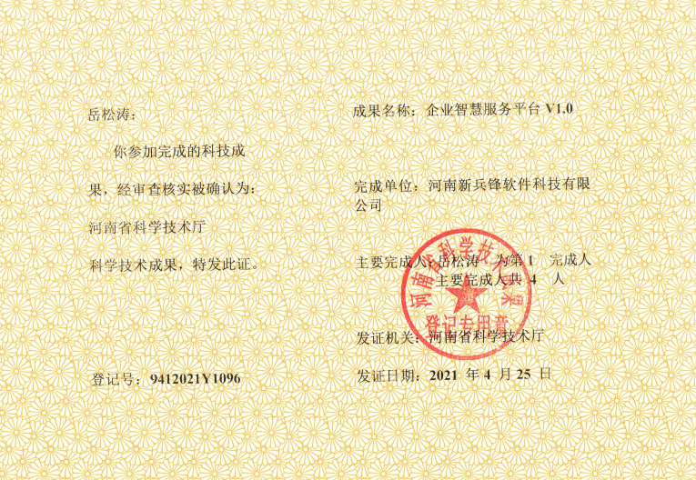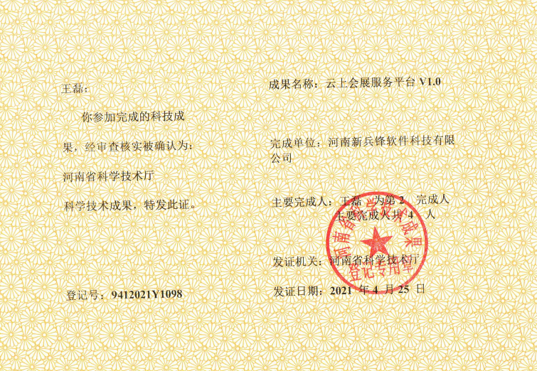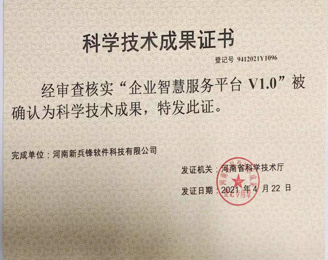 近日,兵锋软件“企业智慧服务平台”、“智慧防疫系统”、“云上会展服务平台”3个项目通过河南省科学技术厅的审核,荣获科学技术成果证书!