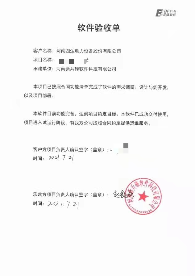 2021年7月21日,河南四达电力设备有限公司系统项目竣工验收召开会议,竣工验收组分别在软件验收单上签字,该项目顺利通过竣工验收。