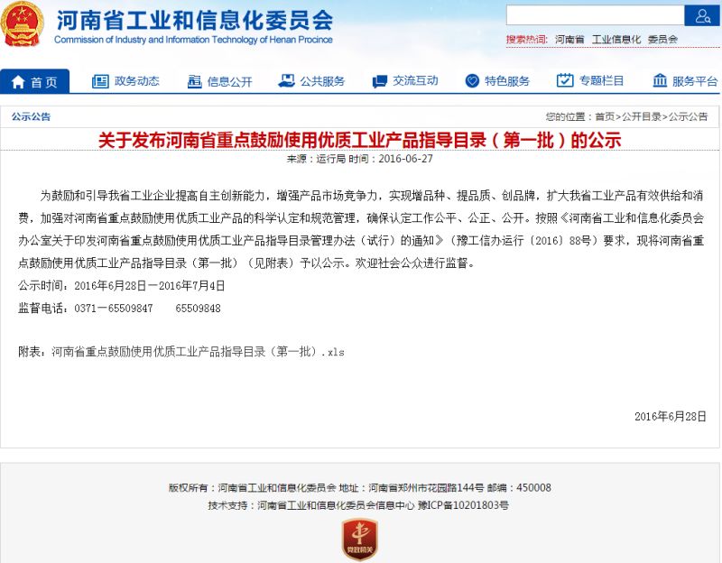 根据“豫工信明电〔2016〕22号-关于报送首批河南省重点鼓励采购使用省内工业产品的通知”文件指示,我司申报了河南省重点鼓励使用优质工业产品指导目录(第一批),并成功入围。
