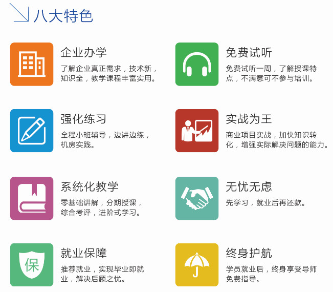 兵锋软件开发培训为了达到强化学员对理论基础知识的掌握,增强解决项目实际问题的能力,采取商业项目实战的教学方法,通过理论学习,上机实践,老师指导,学员动手,结合公司商业项目,将所学知识运用在实际商业项目中解决问题。即强化了理论知识的掌握,又增强了实践动手能力,还让学员从中获得劳动成果,加快从学员向专业软件开发从事业的转变。