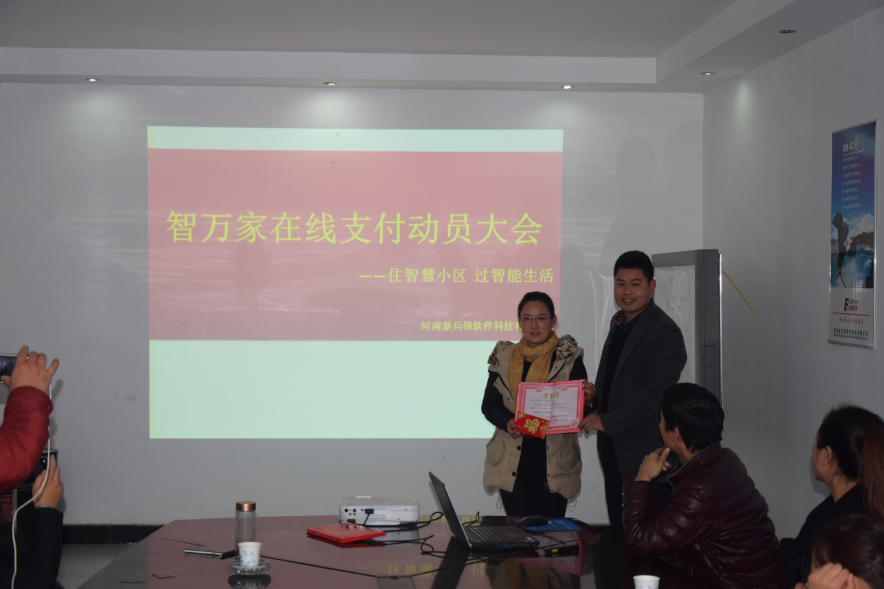接下来是颁奖环节,公司根据2016年度各物业小区对智万家在线物业服务的推动工作,评选出了洛阳九川物业管理有限公司管理的九川国际城为“推动工作先进小区”,颁发荣誉证书并给予200元奖金作为奖励。九川物业马经理也给大家分享了使用智万家物业管理平台和在线物业缴费所带来的便利。