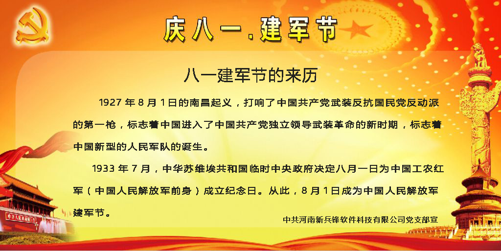 中共河南新兵锋软件科技有限公司热烈庆祝八一建军节91周年,在八一建军节来临之际,号召公司全体党员和全体员工学习“两学一做”,做优秀员工。