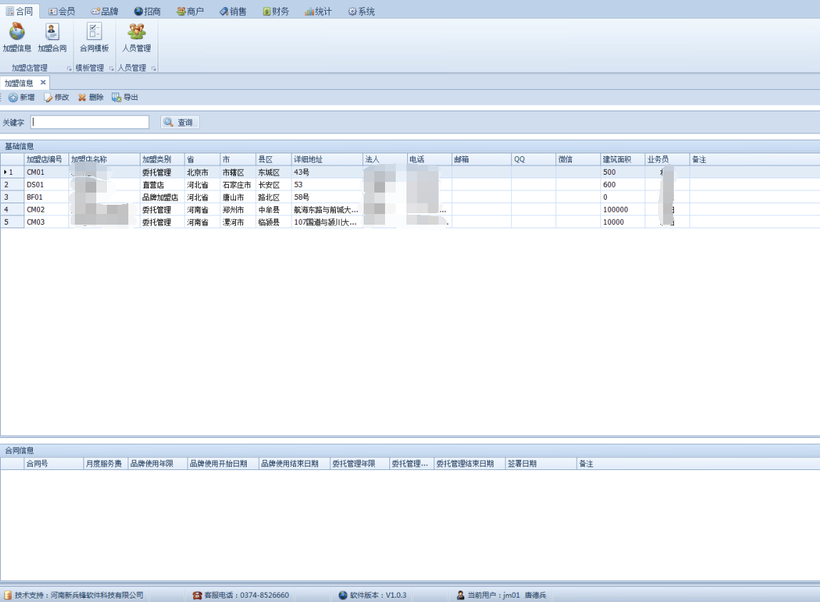 | 加盟管理 | 基本信息 | 合同基础信息维护,新合同录入,加盟商联系信息等。 |