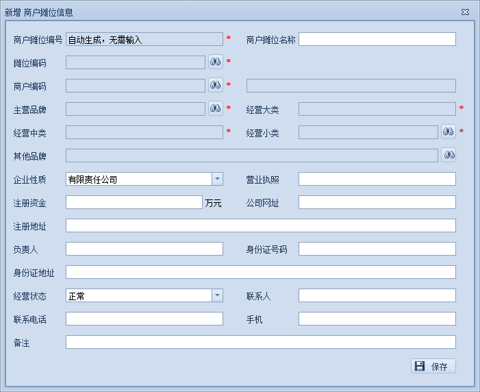 | 财务信息 | 该租户的销售情况所涉及的财务结算信息,和租户产生的租金,水电信息。销售统计,应收应付统计等财务信息。 | |