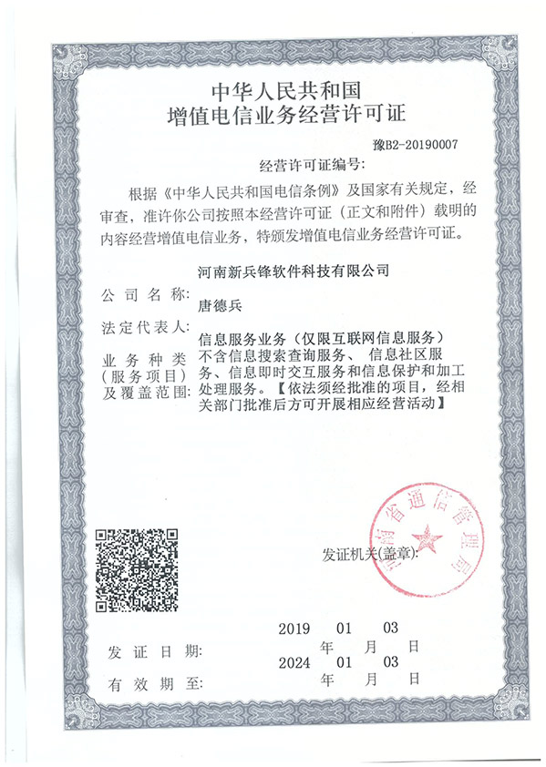 2019年1月3日,河南新兵锋软件科技有限公司获得了由河南省通信管理局为兵锋软件颁发了《中华人民共和国增值电信业务经营许可证》。
